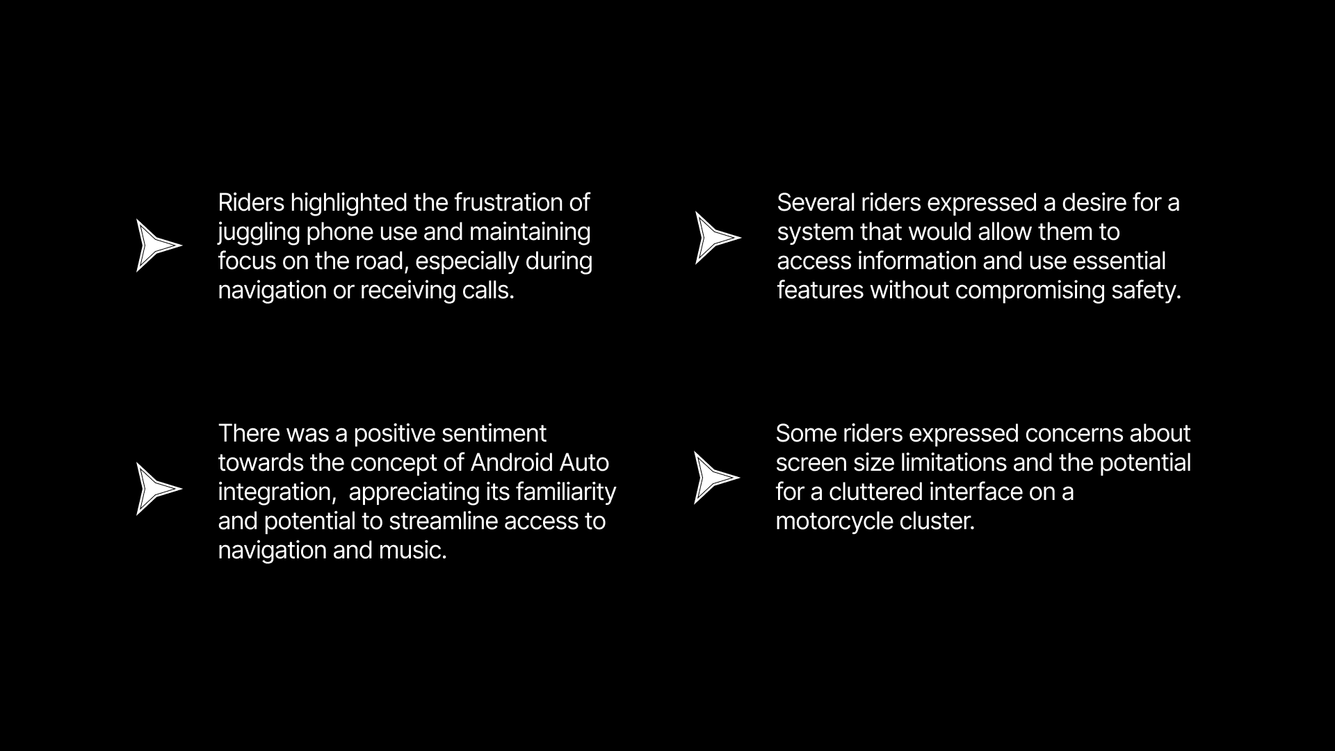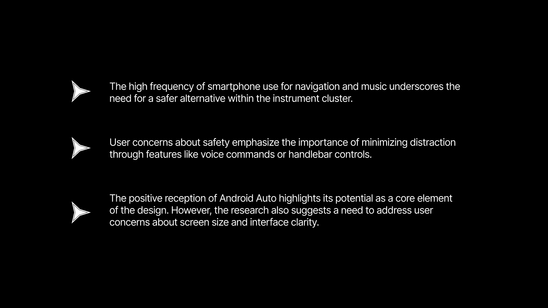 Based on these findings, the initial project scope could focus on integrating core functionalities (navigation, music) within the Android Auto interface on the motorcycle cluster. The design should prioritize a clear and concise layout to avoid information overload on the display.