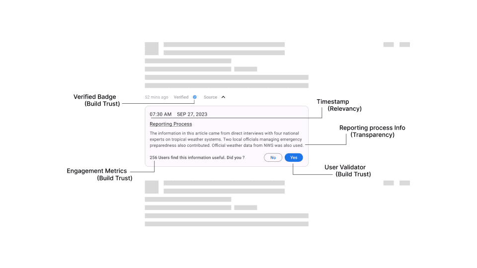 The concept driving this design was to ensure that readers receive abundant information about the sources used in crafting a news article. To capture the reader's attention, a reporting process box is prominently positioned at the top of the screen. This box seamlessly integrates source details with the article content, fostering transparency.