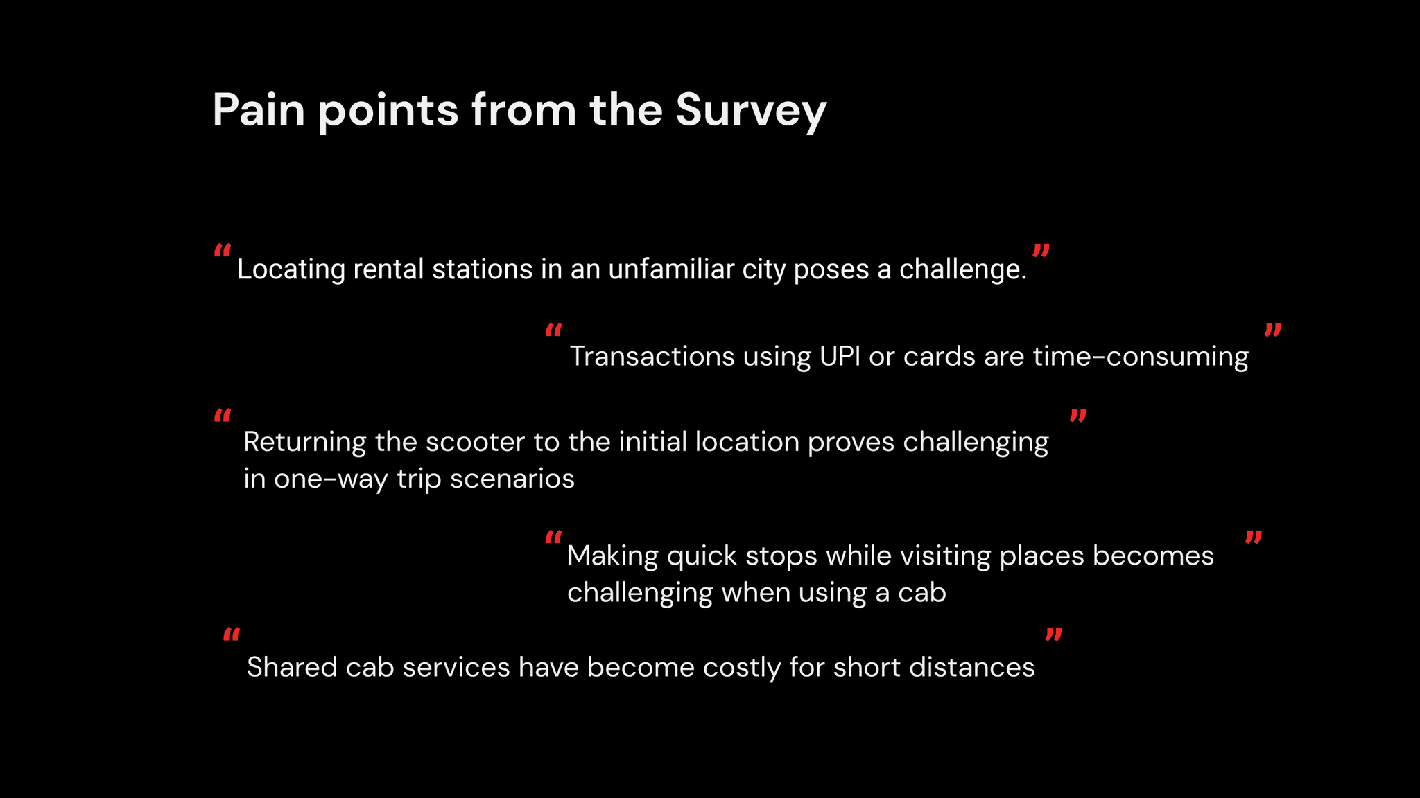 The surveys delved into participants' current commuting habits, environmental considerations, and perceptions of these sustainable modes of transportation. Additionally, we conducted one-on-one interviews with users, both regular and hesitant, to uncover their motivations, reservations, and specific preferences related to short-distance commuting.